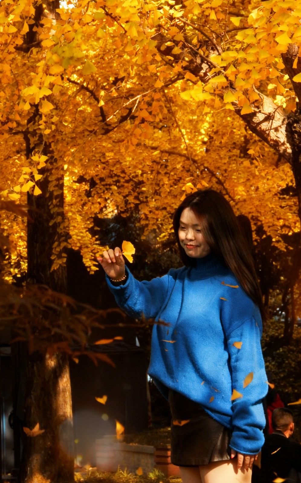 站在川博的银杏树下,仰头望去,满树的金黄如同一把把小扇,在微风中轻轻摇曳。阳光穿过叶隙,洒下斑驳的光影,落在青灰色的地砖上,也落在往来游人的肩头。第一幅照片里的姑娘,指尖捻着一枚银杏叶,那叶片的黄,纯粹得如同秋日的私语,在她蓝色毛衣的映衬下,愈发显得明媚动人。这让我想起了李清照的那句 “倚门回首,却把青梅嗅”,只是此刻,嗅的不是青梅,而是满树银杏的芬芳,那是属于秋天的、带着暖意的香。