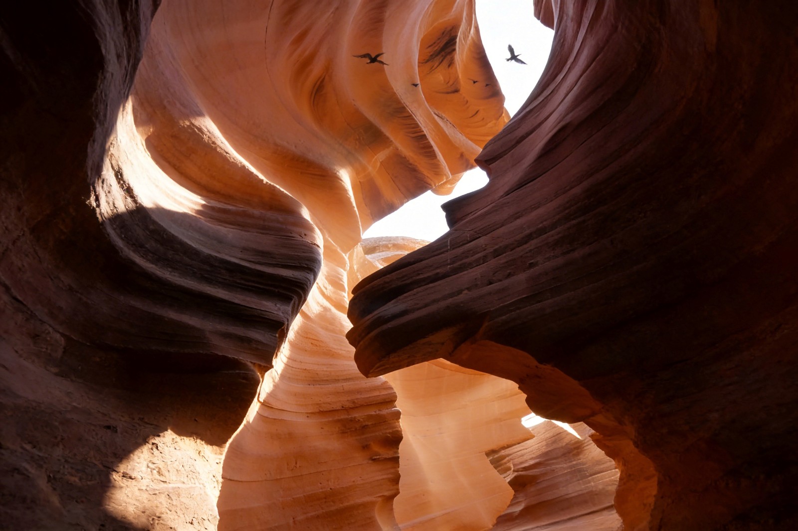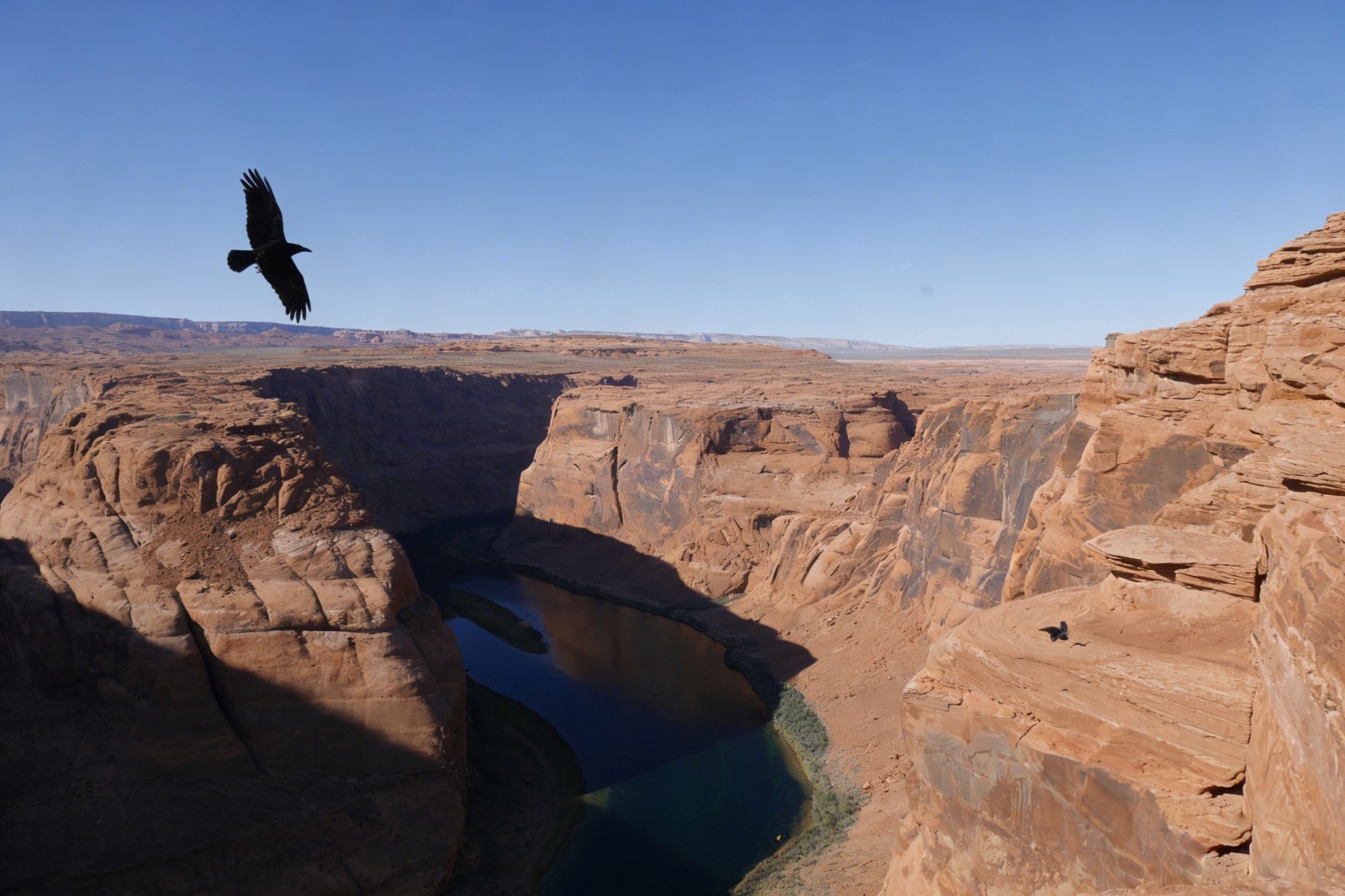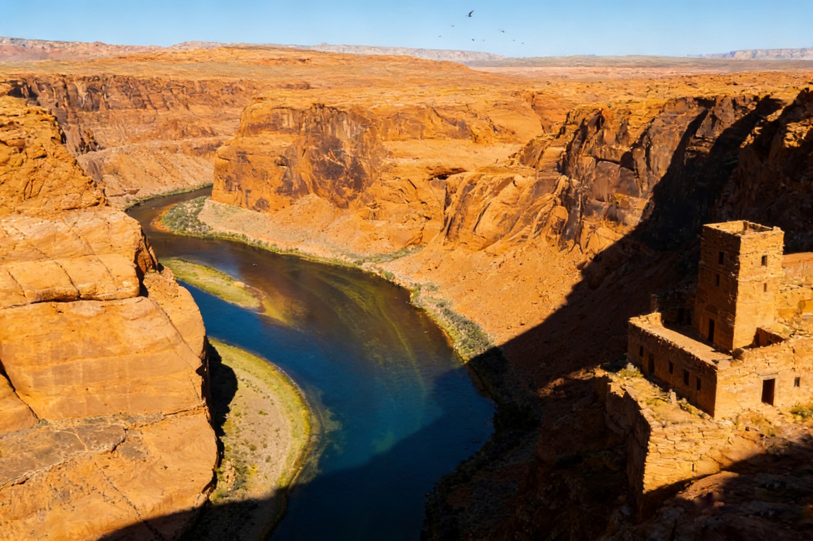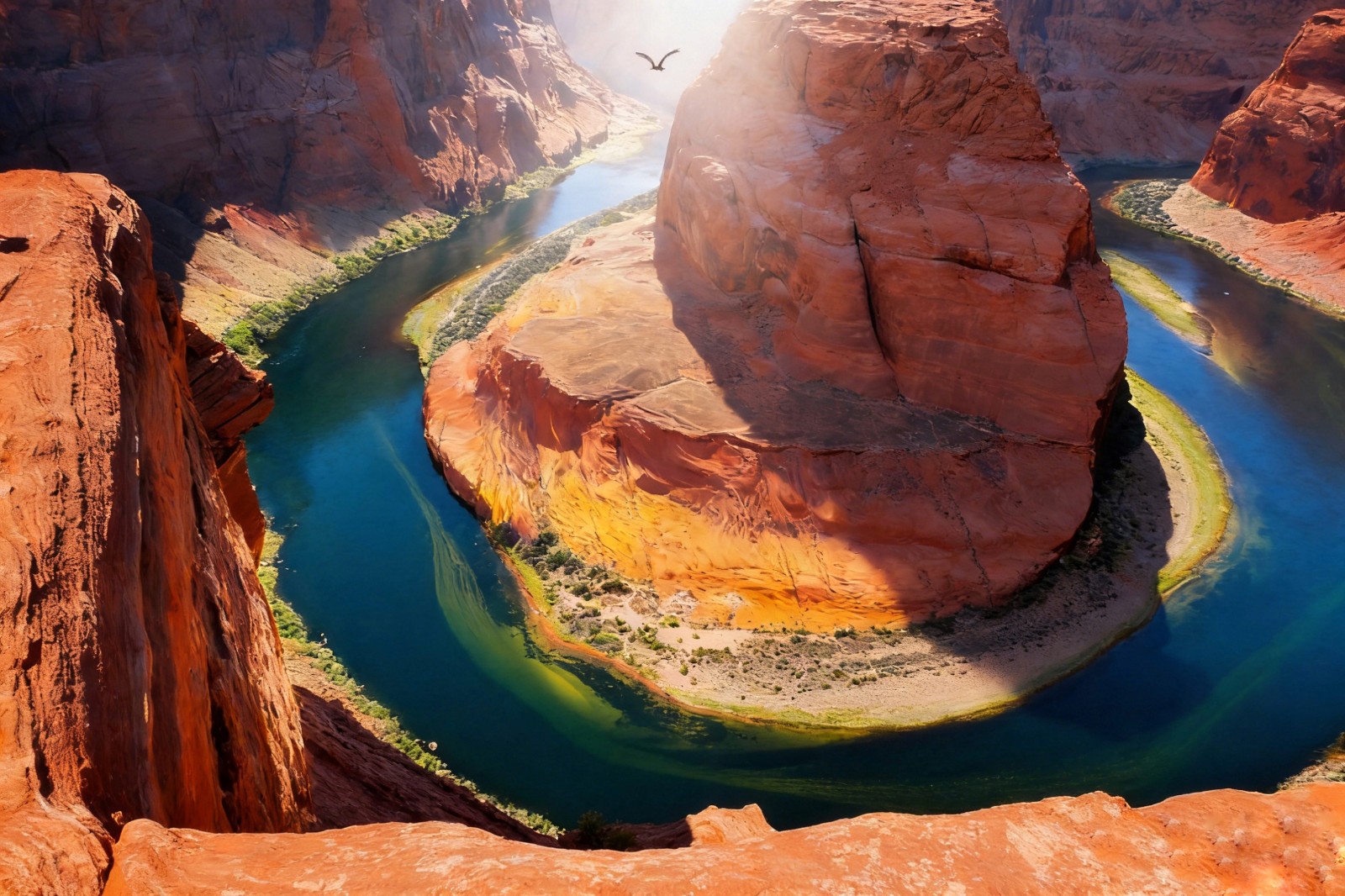 晨光熹微时抵达峡谷,是捕捉它灵魂的最好时刻。初升的太阳越过高原,把第一缕金光洒向谷底的科罗拉多河,河水如一条碧绿的丝带,在红褐色的崖壁间蜿蜒。水汽从河面蒸腾而起,与峡谷的晨雾缠绕,远处的崖顶若隐若现,像悬浮在云端的城堡。沿着小径往谷底走,空气渐渐温热起来,岩壁上的化石纹路愈发清晰:三叶虫的印痕嵌在页岩里,远古贝类的外壳与岩层融为一体,仿佛伸手就能触碰到亿万年前的海洋。风掠过耳畔,带着河水的清凉与岩石的粗犷,偶尔有鹰隼从头顶盘旋而过,尖啸声划破寂静,惊起崖壁上栖息的鸣禽,细碎的鸟鸣落进峡谷,与河水的潺潺声交织成自然的乐章。