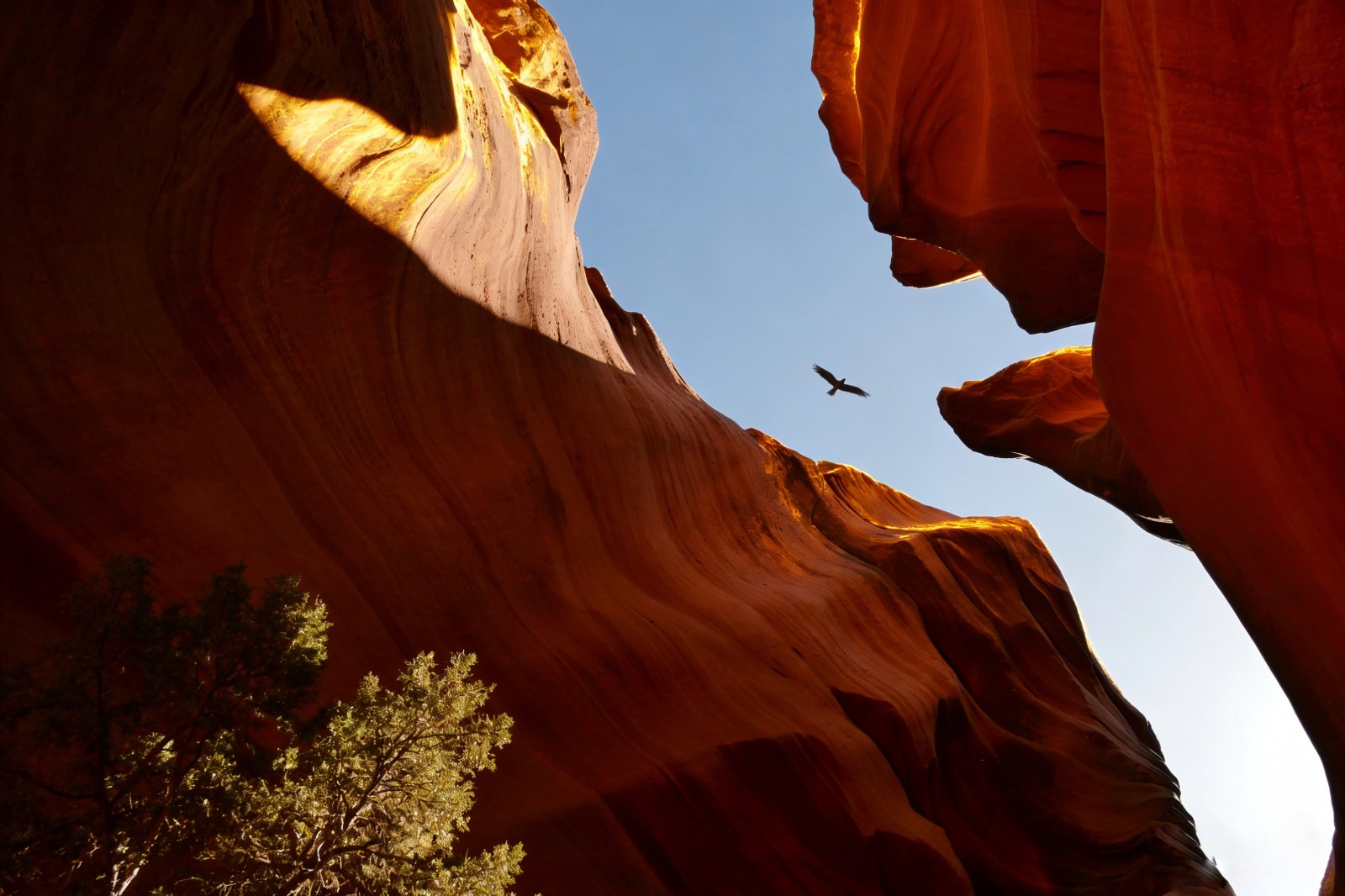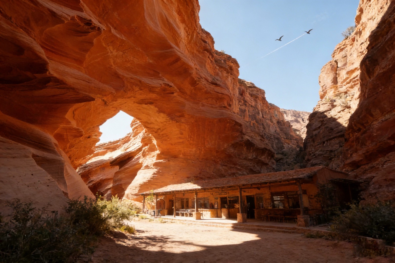 黄昏是峡谷最温柔的时刻。夕阳西沉,把天空染成橘粉与绛紫,崖壁的颜色渐渐变深,从金红转为暗红,最后凝成墨色的剪影。河水倒映着晚霞,成了流动的彩绸,河畔的灌木披上金光,连风中的尘土都闪烁着细碎的光芒。坐在崖边的岩石上,听河水拍打着礁石,看归鸟掠过天际,忽然懂得什么是 “天地有大美而不言”。峡谷沉默着,却比任何语言都更有力量:它见过恐龙的繁盛与灭绝,见过冰川的消融与扩张,见过人类从蛮荒走向文明,而它始终站在这里,以不变的姿态,接纳着时光的洗礼。