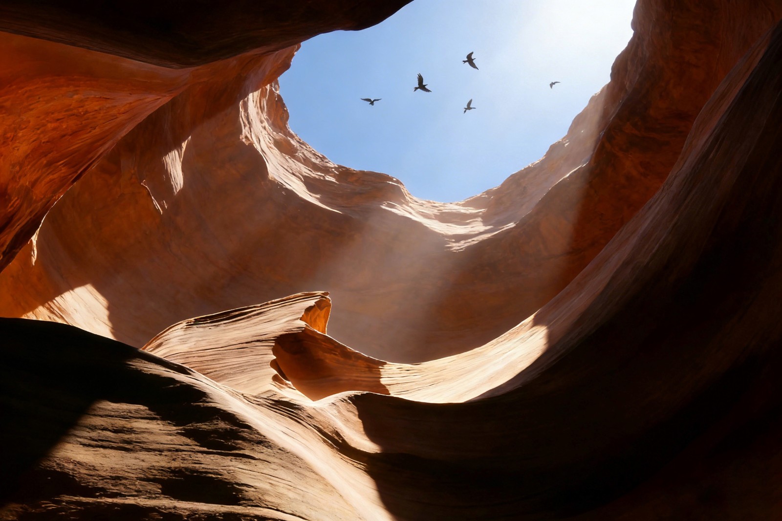 正午的阳光炽烈如火,把峡谷烤得发烫,崖壁的色彩却愈发浓烈。赭红的砂岩在阳光下泛着玛瑙般的光泽,浅黄的石灰岩与深灰的玄武岩交错,像上帝打翻的调色盘。站在悬空玻璃观景台上,脚下是透明的玻璃,深渊在咫尺之外,科罗拉多河细如银线,在谷底静静流淌。此刻的峡谷褪去了晨雾的朦胧,露出最磅礴的轮廓:垂直的崖壁如刀削斧凿,层层叠叠的岩层记录着地球的脉动,那些因地壳运动隆起的褶皱,因河水冲刷形成的阶地,都是自然力量的见证。有人说,大峡谷是地球的伤口,可这伤口里,却藏着最壮丽的重生 —— 每一次岩层的断裂,每一次河水的冲刷,都在塑造新的地貌,让这片土地在毁灭与新生中轮回,成了永恒的风景。